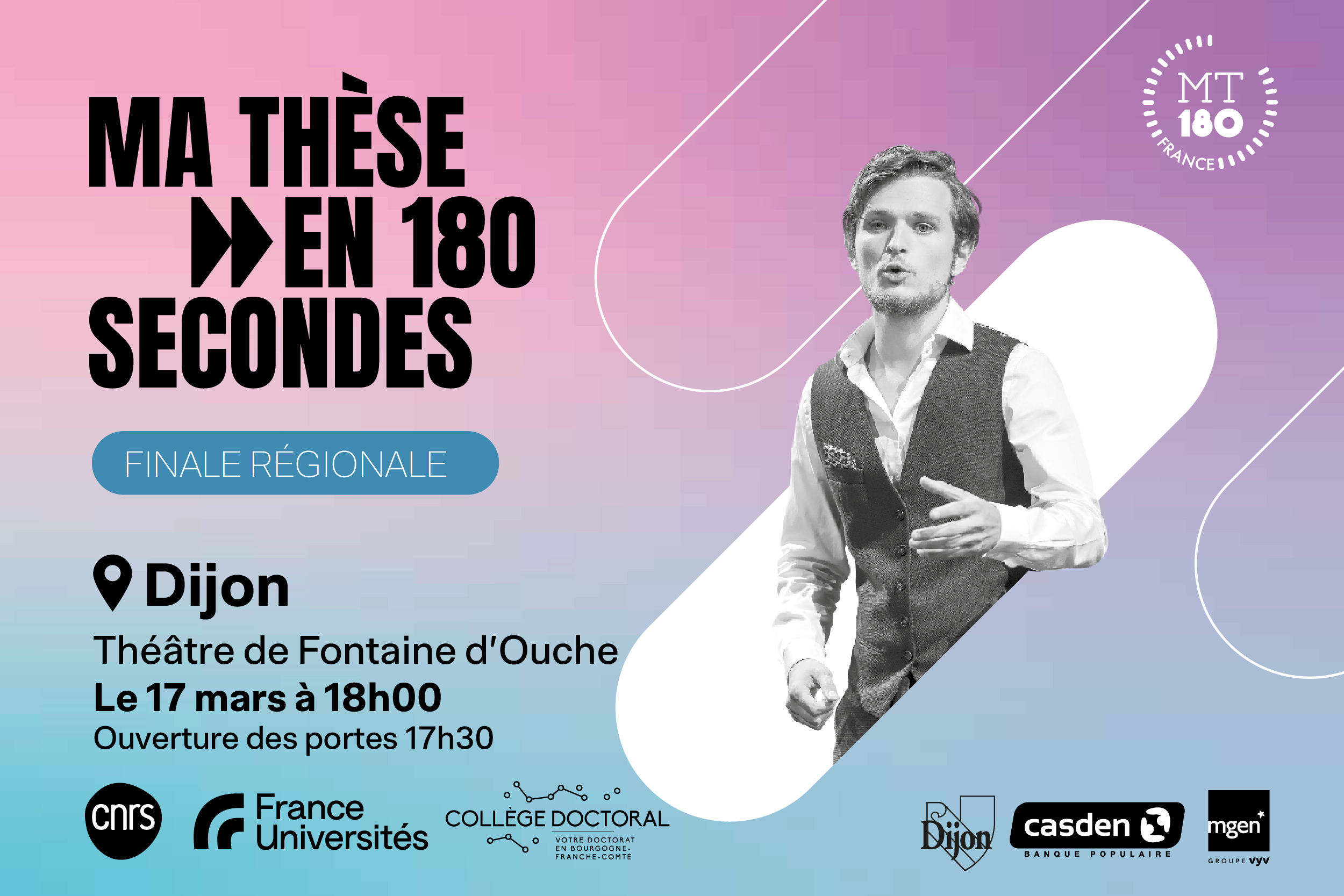 La finale régionale de l’édition 2026 du concours Ma Thèse en 180 secondes se tiendra le 17 mars au Théâtre de Fontaine d’Ouche à Dijon. Dix doctorantes et doctorants bourguignons et franc-comtois tenteront de présenter leur sujet de recherche en seulement trois minutes, de manière claire, accessible et engageante pour le grand public. Une belle occasion de s’initier aux sciences de façon ludique.